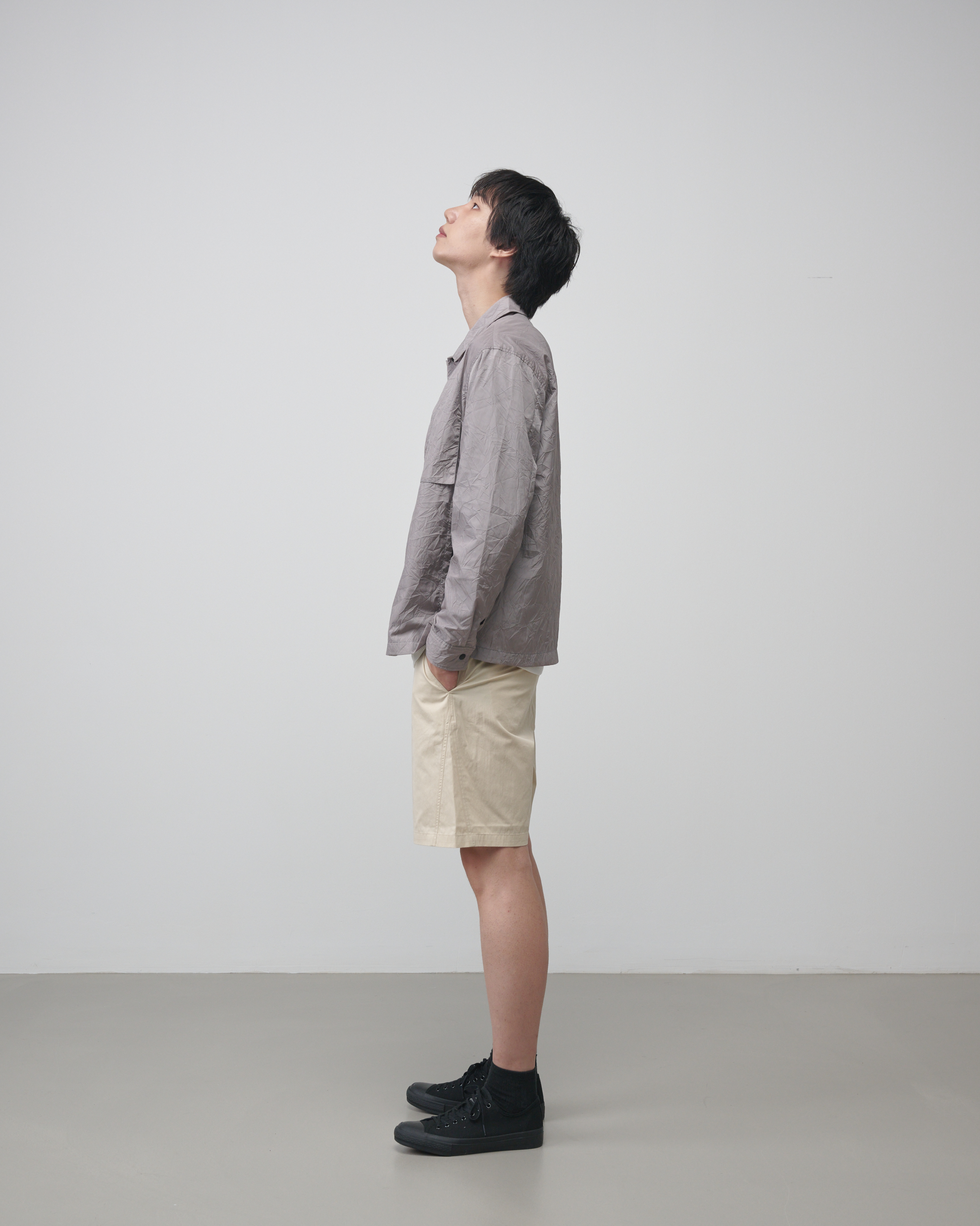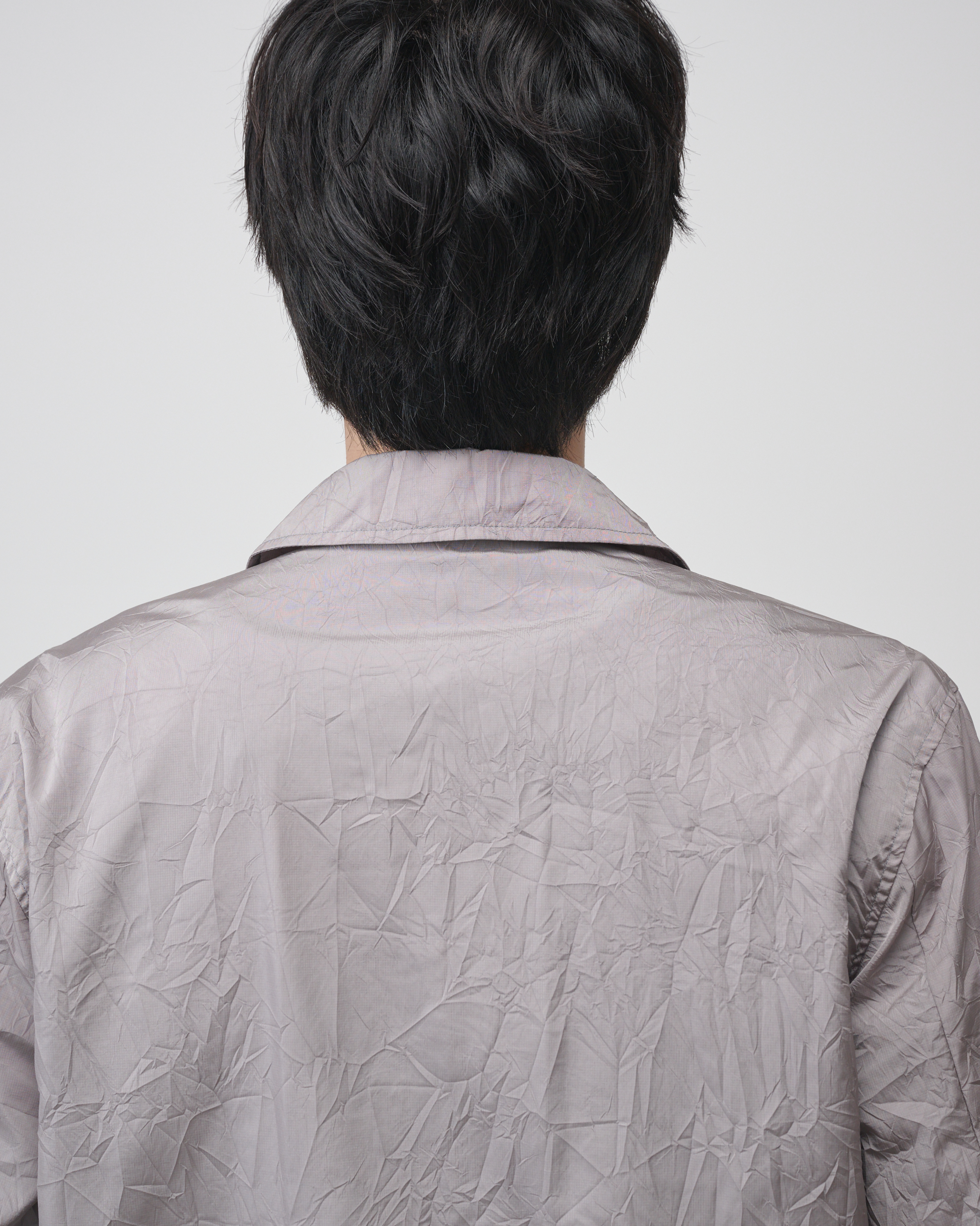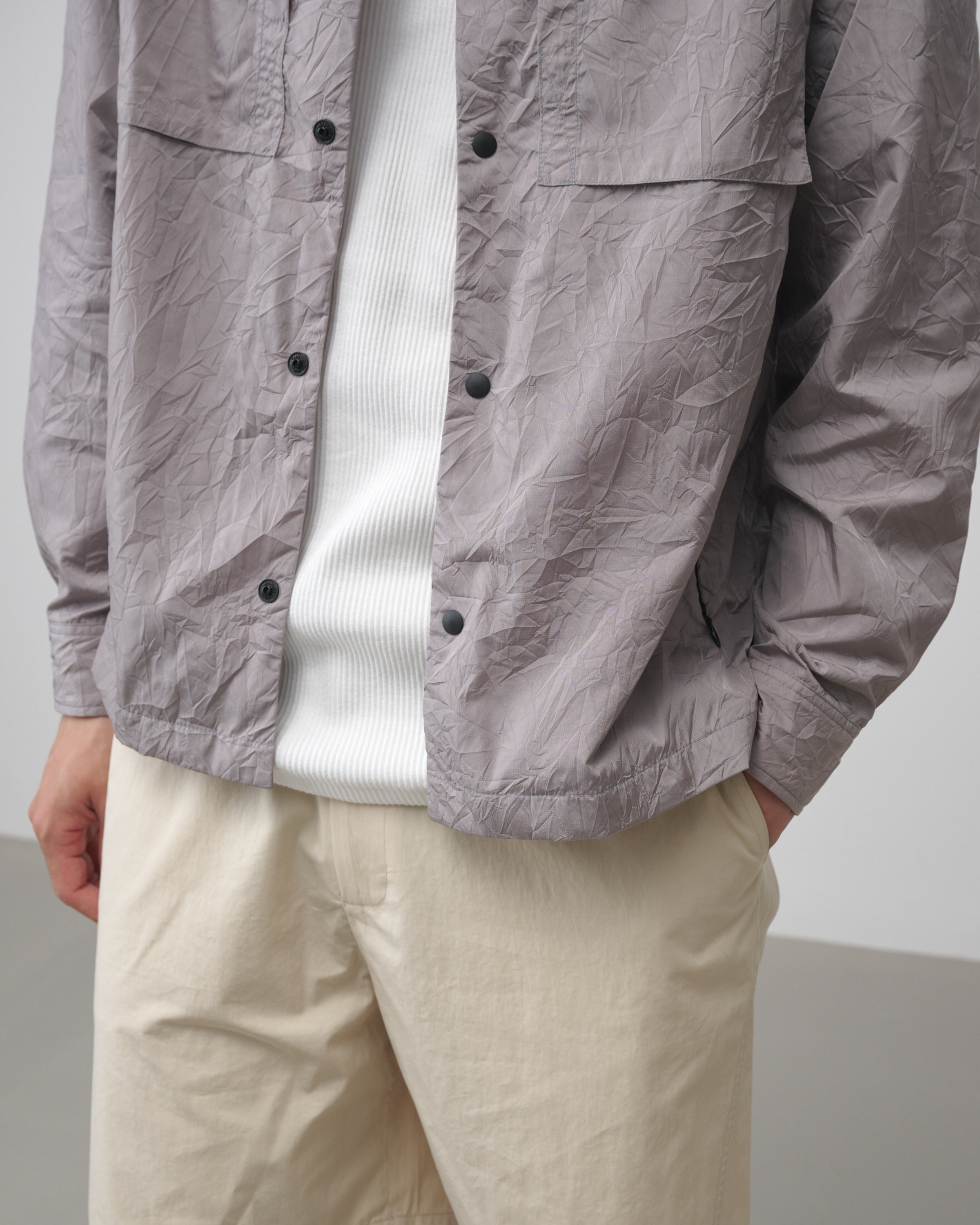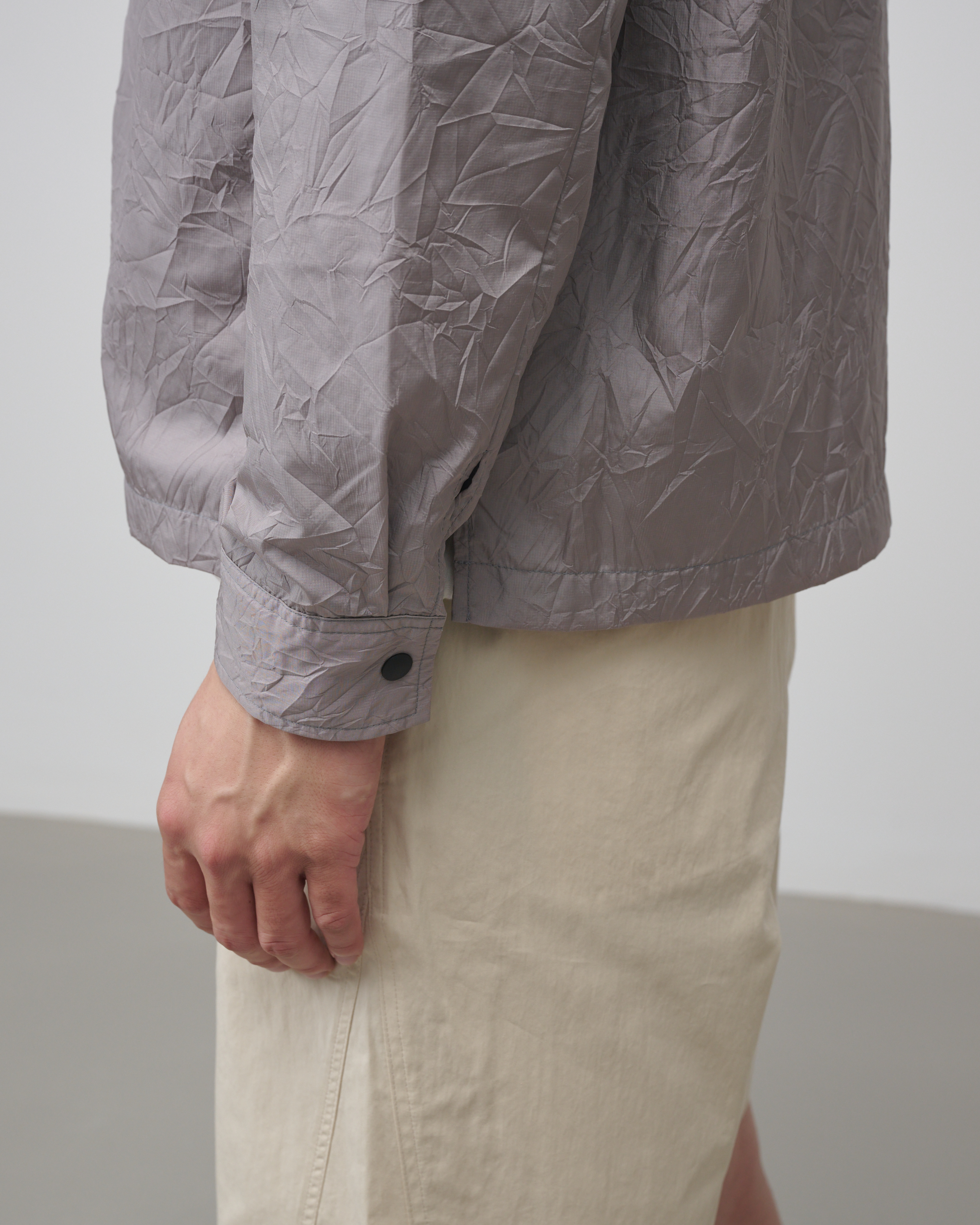 [LAMPO] 크리즈 오버셔츠는 버진 나일론과 리사이클 나일론이 혼합된 매트한 질감의 경량 나일론으로 제작된 가벼운 아우터입니다.