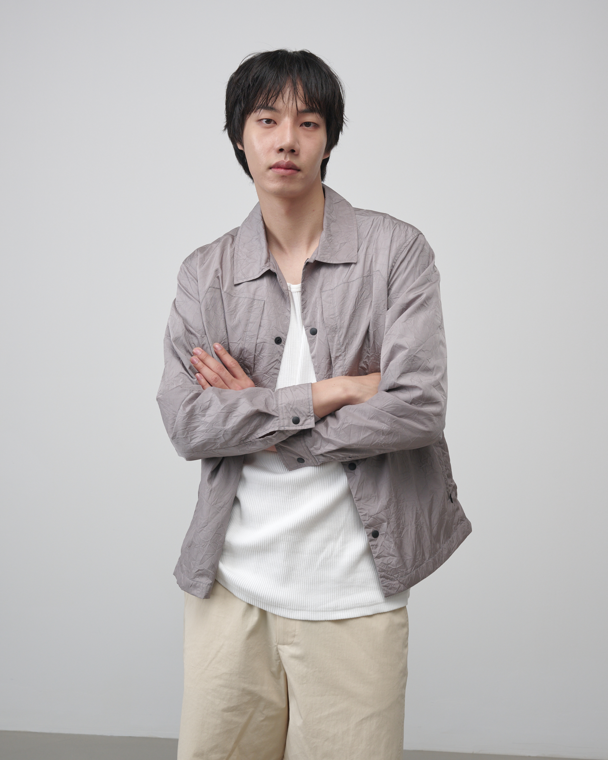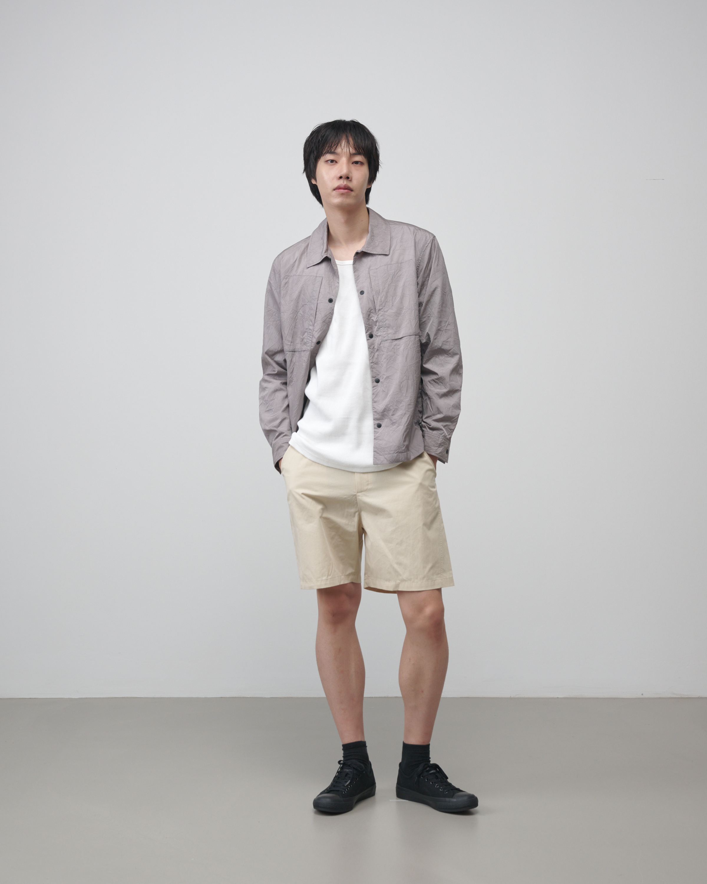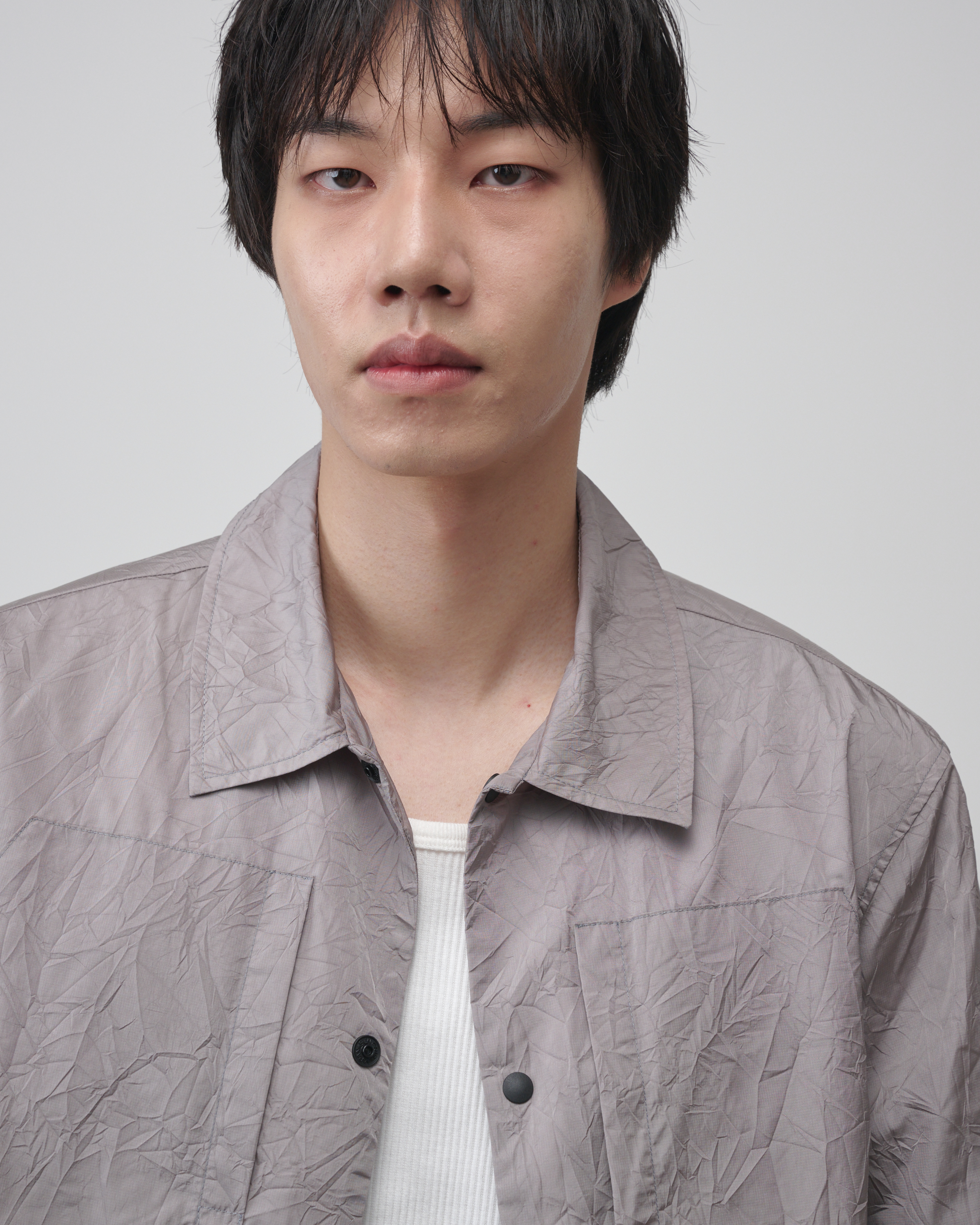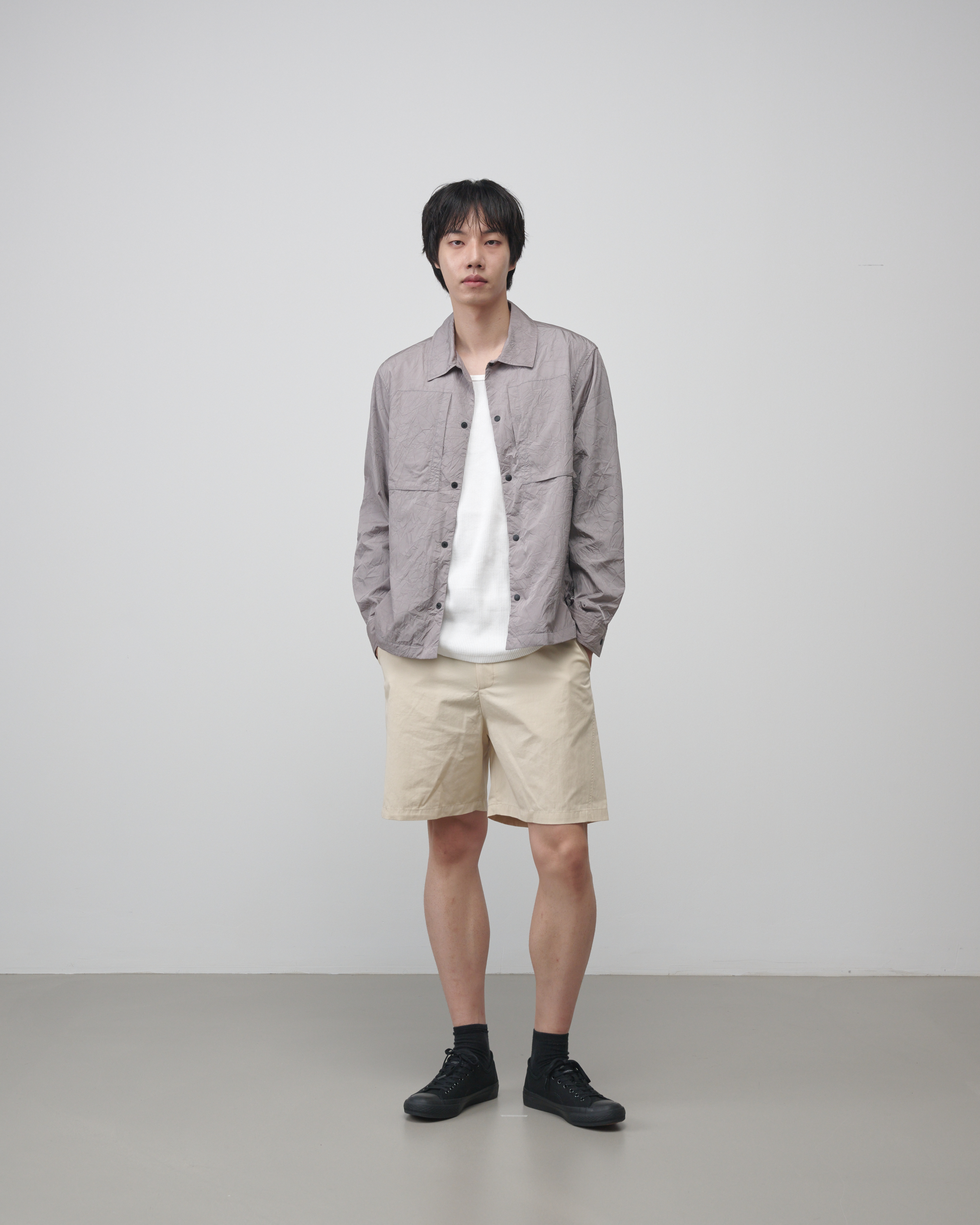 [LAMPO] 크리즈 오버셔츠는 네이비와 세이지 그레이 두 가지 컬러로 출시되었으며, 스트릿, 테크웨어, 고프코어 등 다양한 스타일에 자연스럽게 어울리는 경량 아우터입니다.