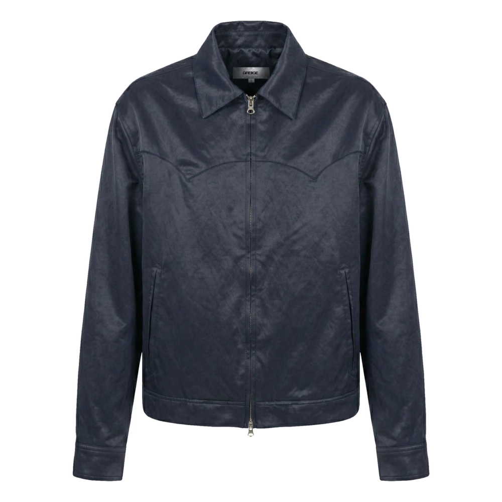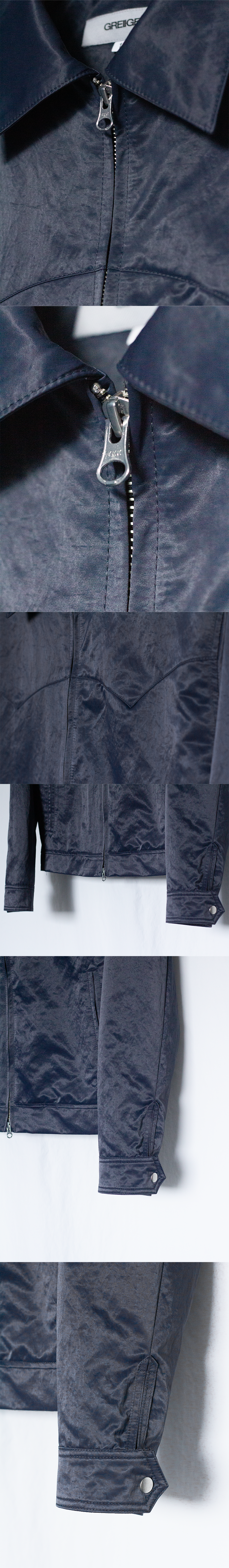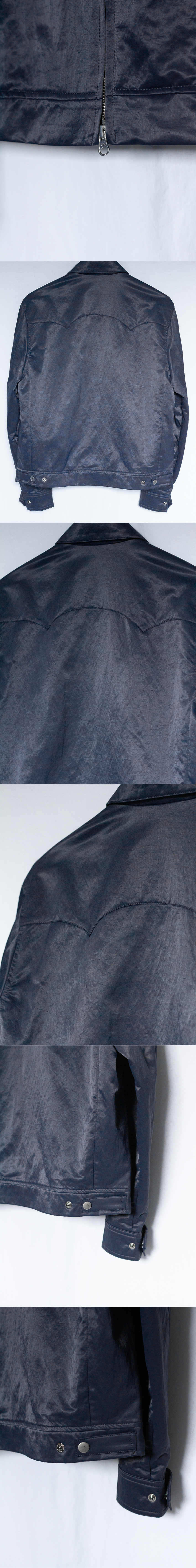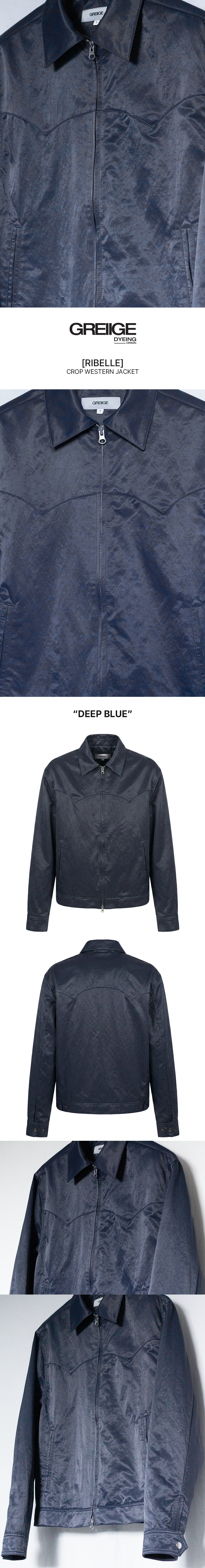 [RIBELLE]는 마치 레더같은 은은한 광택감의 딥 블루 컬러의 나일론 원단이 특징인 크롭 웨스턴 자켓입니다.