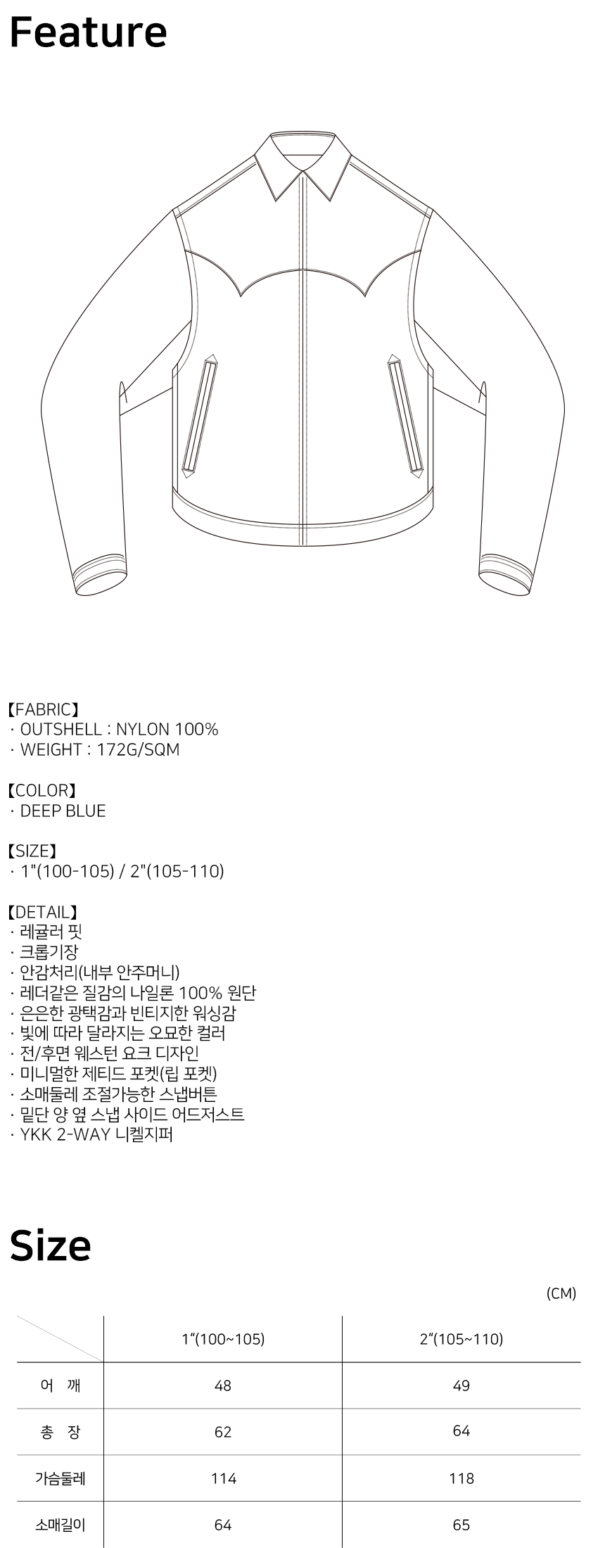 소매 스냅 버튼과 밑단 양 사이드 어드저스트 스냅을 통해 체형과 스타일에 맞게 실루엣 조절이 가능하며, YKK 2-WAY 니켈 지퍼를 적용해 다양한 스타일링이 가능합니다.