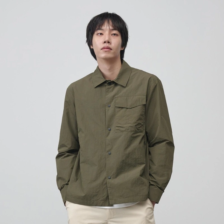 [LAMPO] 크리즈 오버셔츠는 버진 나일론과 리사이클 나일론이 혼합된 매트한 질감의 경량 나일론으로 제작된 가벼운 아우터입니다.