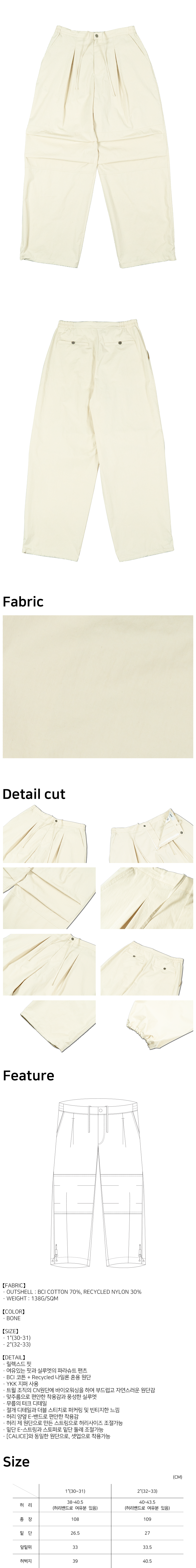 허리 엘라스틱 밴드와 스트링, 밑단 스트링으로 핏 조절이 가능하며, 제원단 스트링이 내장되어 벨트 없이도 허리 사이즈 조절이 가능합니다.